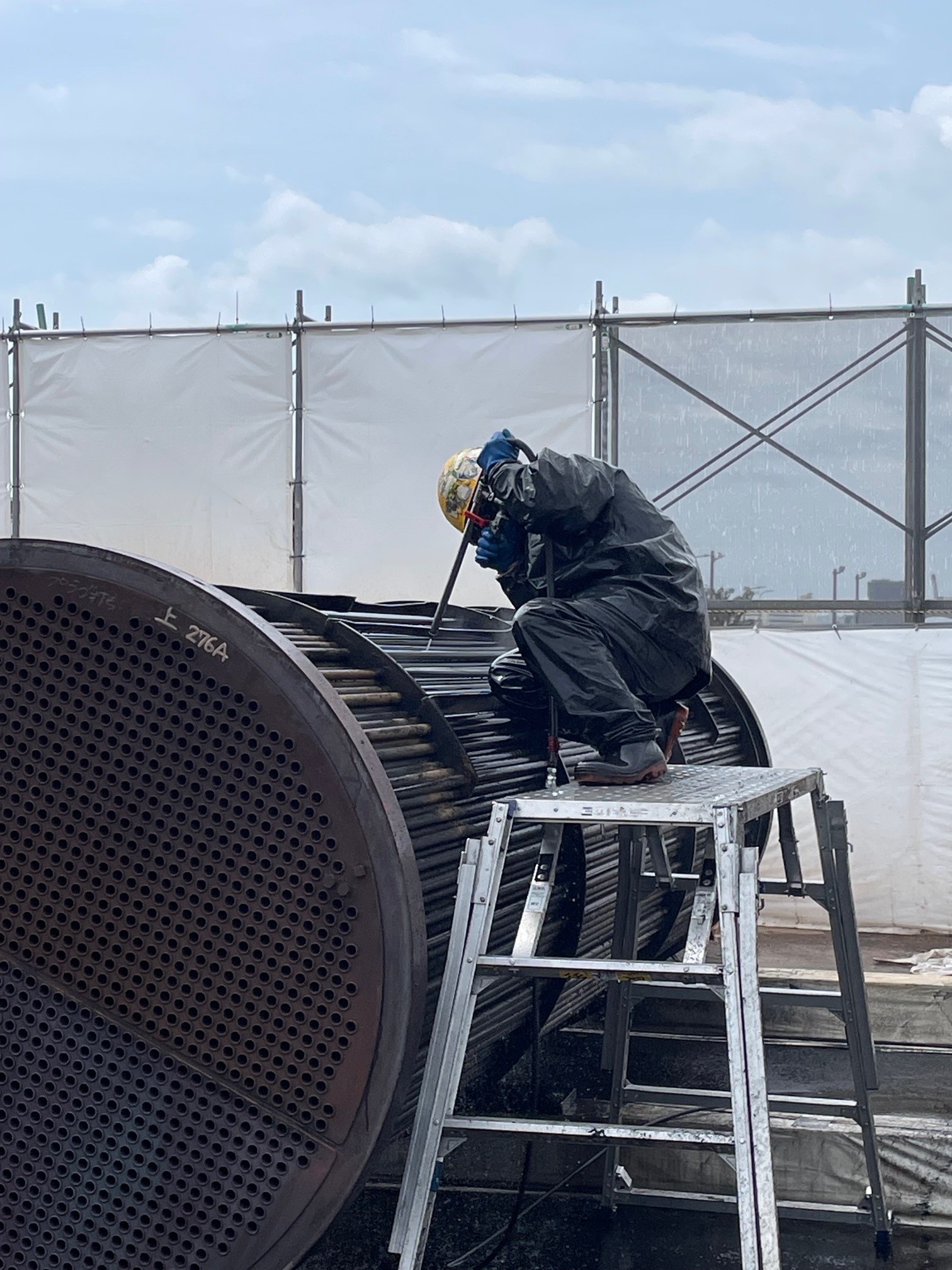今回は精密洗浄と言うことで、100MPaの圧力でスピンノズルを使用して、3回通しを行う御要望でしたが、問題なく予定工期内で工事を完了させることが出来ました。お客様からも高評価を頂き、他の縦型熱交でも適用したいとのお言葉を頂きました。